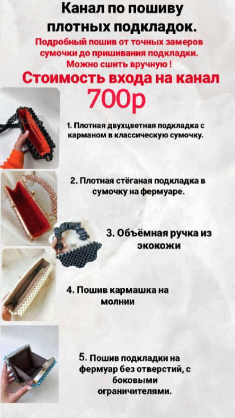 3️⃣. Канал по пошиву плотных, безупречно сидящих подкладок в разные модели сумочек. Информация на этом канале чуть отличается от основного обучающего и включает дополнительные виды подкладок. Этот канал также регулярно пополняется новыми мастер-классами, чтобы ваше мастерство росло. Стоимость доступа - 7️⃣0️⃣0️⃣рублей.